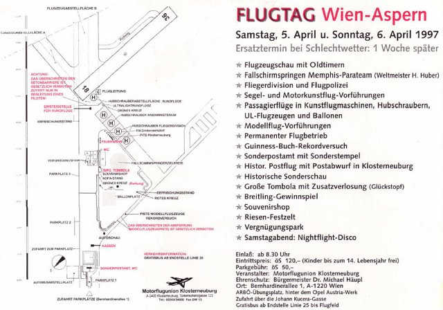 05., 06., 12. und 13.04.1997 | Jubiläumsflugtag am seit 1977 geschlossenen ehemaligen Flughafen Aspern. Wegen Schlechtwetters wurde die Veranstaltung mit insgesamt über 5000 Besuchern an zwei Wochenenden hintereinander durchgeführt |