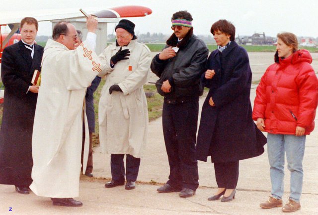 Natürlich durfte auch die obligate Flugzeugweihe nicht fehlen, die vom damaligen 66. Klosterneuburger Propst Bernhard BACKOVSKY durchgeführt wurde. Im Bild der Veranstalter Gustav Z. HOLDOSI (3.v.r.)