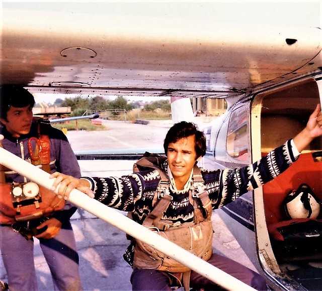 Als Absetzpilot fungierte 1973 auch Gustav Z. HOLDOSI, hier beim ersten Fallschirmsprung 1975 von der OE-DAI