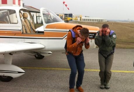 Dabei wird die richtige Haltung während des Fallschirmsprunges geübt und intensiv besprochen.