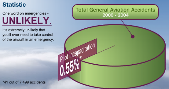 Ihre Eigen-Initiative rettete ihr vermutlich das Leben. Glücklicherweise ist der Ausfall eines Piloten ein sehr seltenes Ereignis, wie Sie der nachfolgenden AOPA-Graphik entnehmen können.